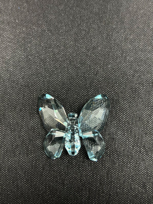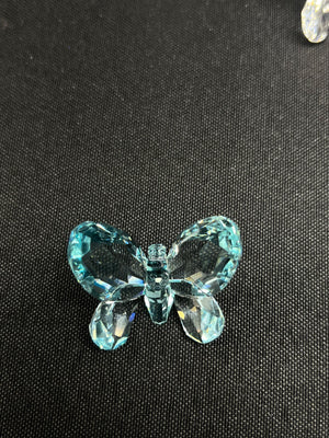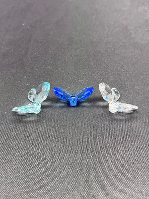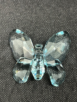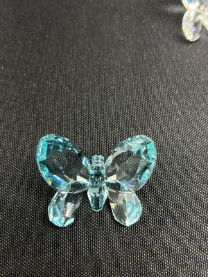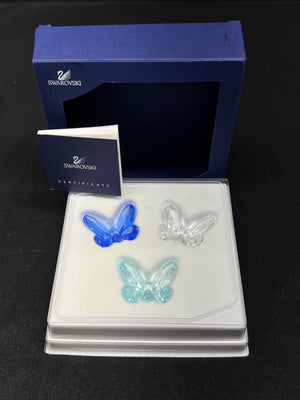 Three Swarovski crystal butterfly figurines in blue, clear, and aquamarine. Made in Austria. Includes original box and booklet. Excellent condition, with no visible chips or imperfections. Each butterfly features detailed faceted craftsmanship, characteristic of Swarovski’s crystal quality.