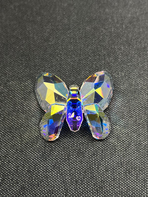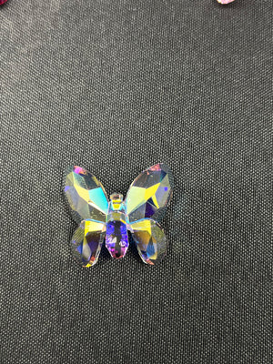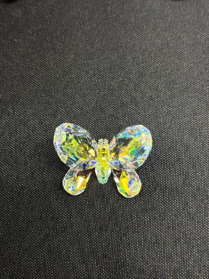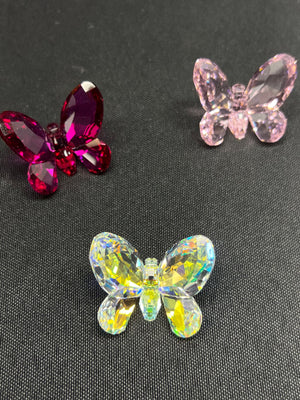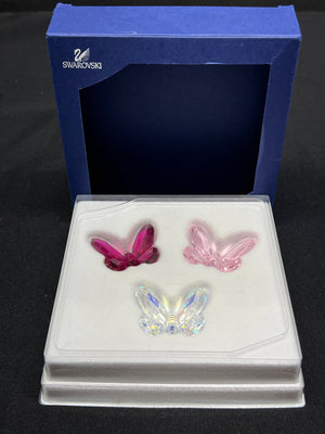 Swarovski crystal butterfly trio set featuring three delicately crafted figurines in red, pink, and iridescent clear shades. Each butterfly is intricately faceted to capture light and comes housed in the original Swarovski packaging. Made in Austria. Perfect for collectors or crystal enthusiasts.