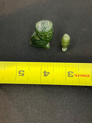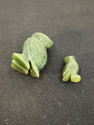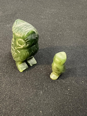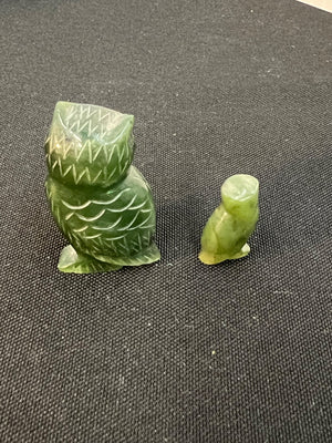 Two hand-carved green stone owl figurines featuring unique detailing. The larger owl measures approximately 3 inches in height, while the smaller measures approximately 1.5 inches. Both are crafted from green-hued stone with etched details highlighting their features. Condition appears good with no visible cracks or chips.