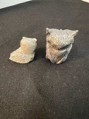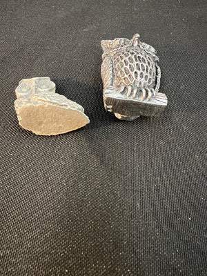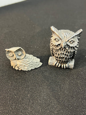 Metal owl figurines, showcasing detailed craftsmanship. The first owl stands upright with a textured body and prominent eyes, while the second is in a reclined position with wings folded. Both items are small in size, with a tape measure in the image showing approximate scales. Suitable for decoration or collection.