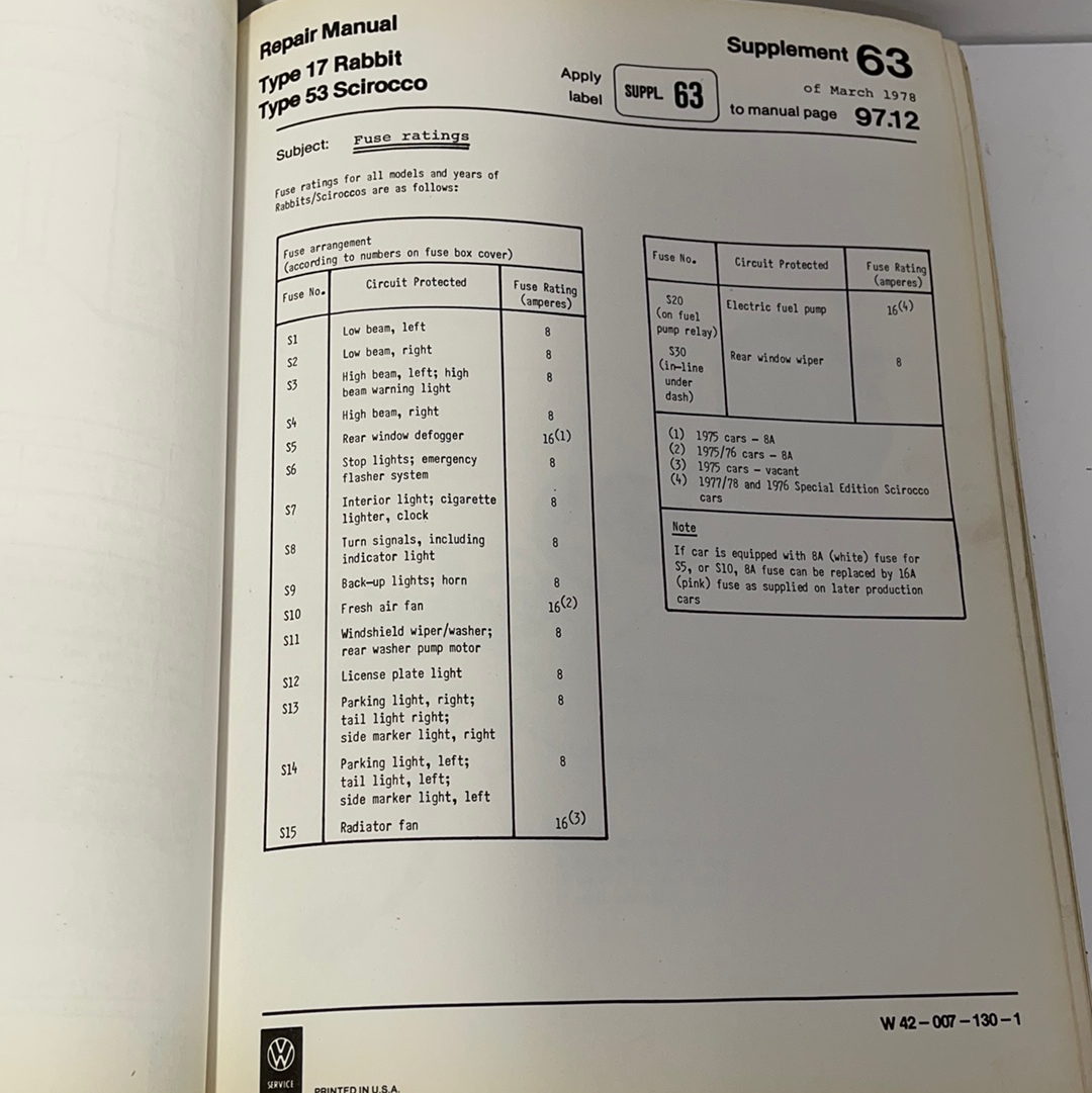 Volkswagen 1975 to 1978 repair manual type 17 rabbit type 53 scirocco